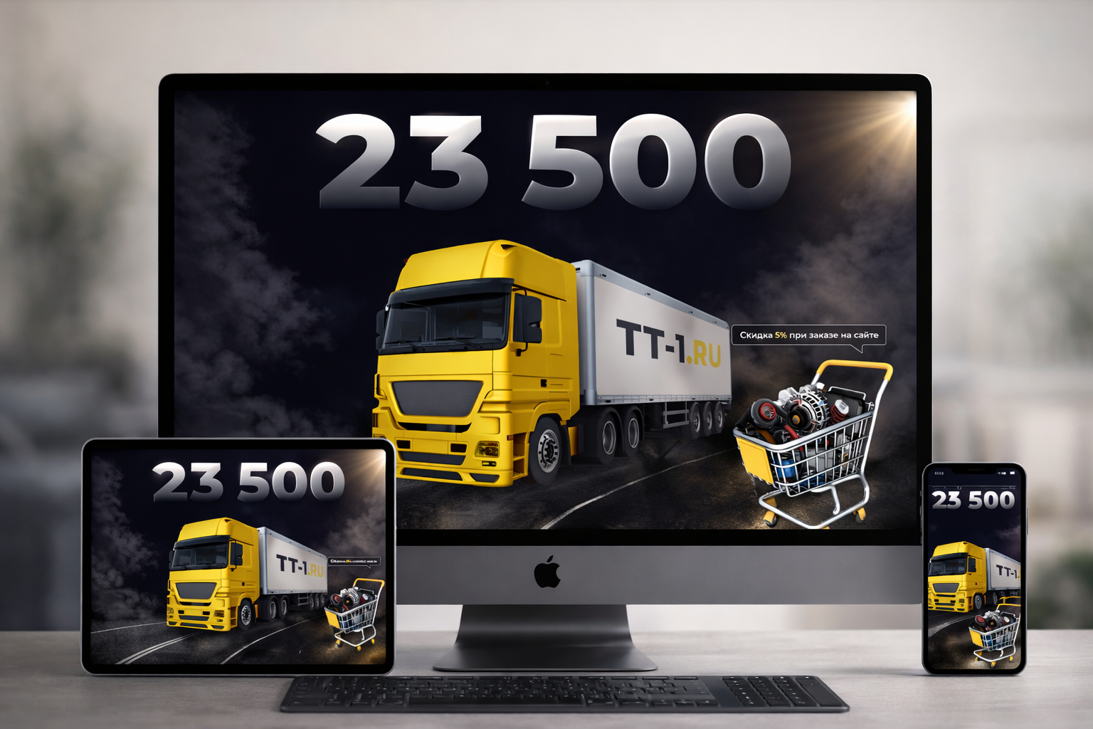 Лучшие сайты для интернет-магазинов автозапчастей обязаны внушать уверенность еще до выбора детали. На главной странице TT-1.ru нет мелочей: крупные формы, контрастный свет, индустриальная драматургия.  Цифры «23 500» висят над сценой как табло на старте гонки, а яркий грузовик прорывается сквозь дым, будто доставка уже выехала. Корзина с запчастями выглядит как трофей, а не как интерфейсный элемент, и этот ход моментально превращает покупку в действие, а не в размышление.